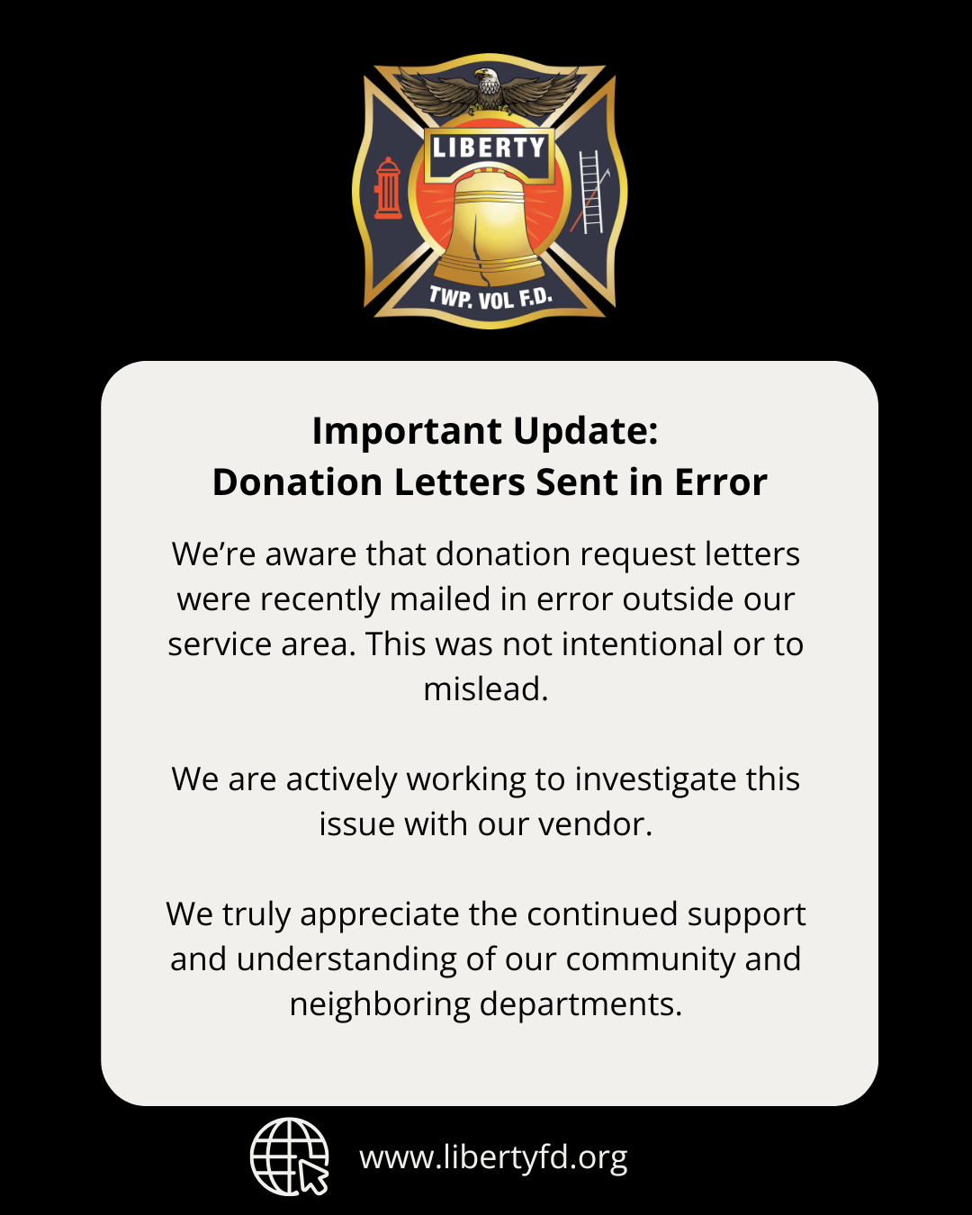 We truly appreciate the continued support and understanding of our community and neighboring departments as we work to correct this mistake. Liberty Township Volunteer Fire Department remains committed to serving with integrity, professionalism, and respect.
